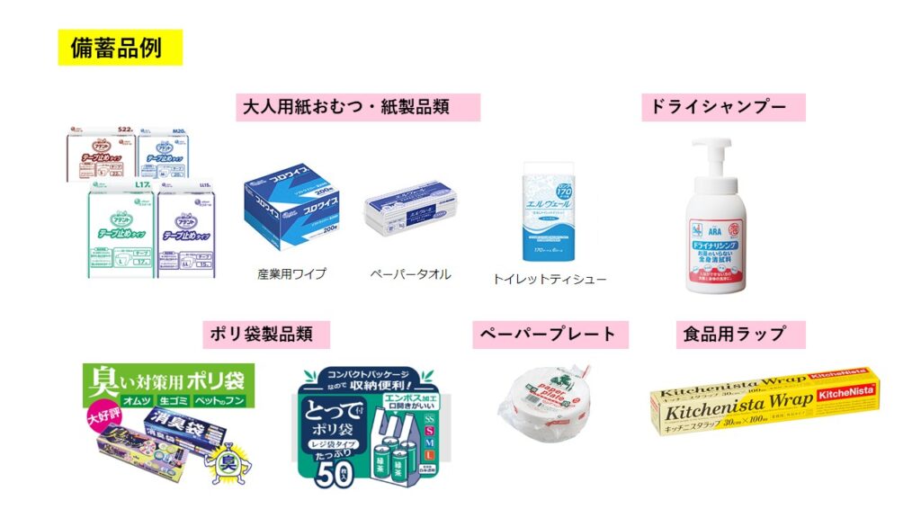 備蓄する物は食料・水だけでなく、介護用品等も備蓄しておく事が重要です。