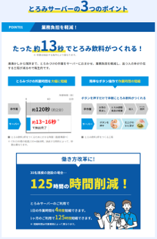 前述の手作業との作業効率・人件費削減効果と比較していただけると「とろみサーバー」その経済性が理解いただけるのではないでしょうか?