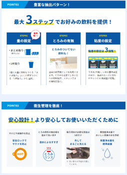 をボタンで選ぶだけで、とろみ調整済飲料を自動抽出。とろみ剤にはつるりんこ(森永乳業クリニコ)を使用し、とろみの濃さは日本摂食嚥下リハビリテーション学会基準の「薄いとろみ」「中間のとろみ」「濃いとろみ」の3段階で調整出来ます。