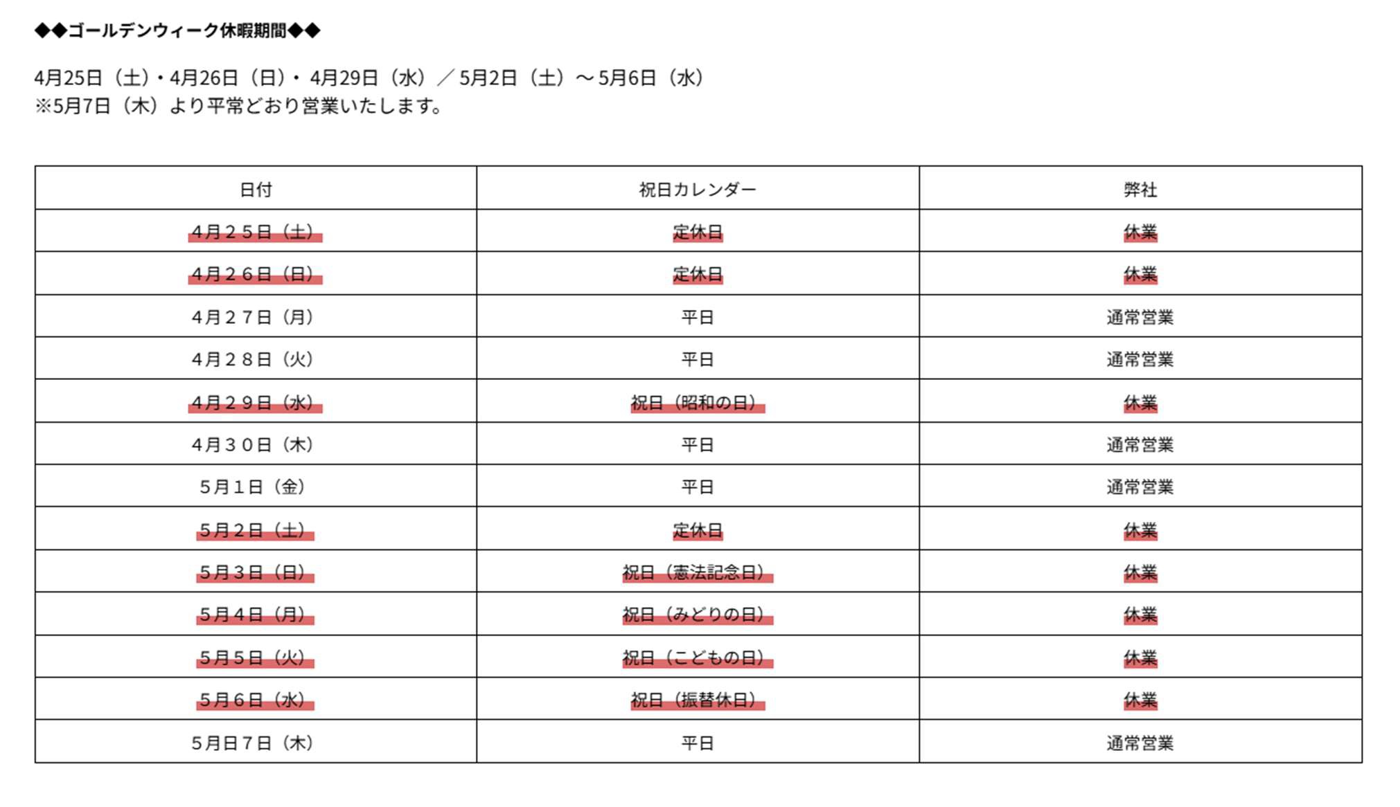 誠に勝手ではございますが、ゴールデンウィーク期間中、弊社は下記のとおりお休みさせていただきます。